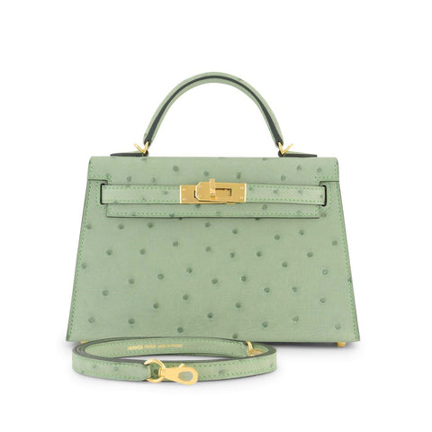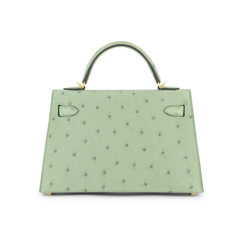 Hermes Vert Criquet Mini Kelly 20cm in Ostrich Leather Gold HardwareIncludes Hermes 2025 invoice, dust-bag, box, strap.